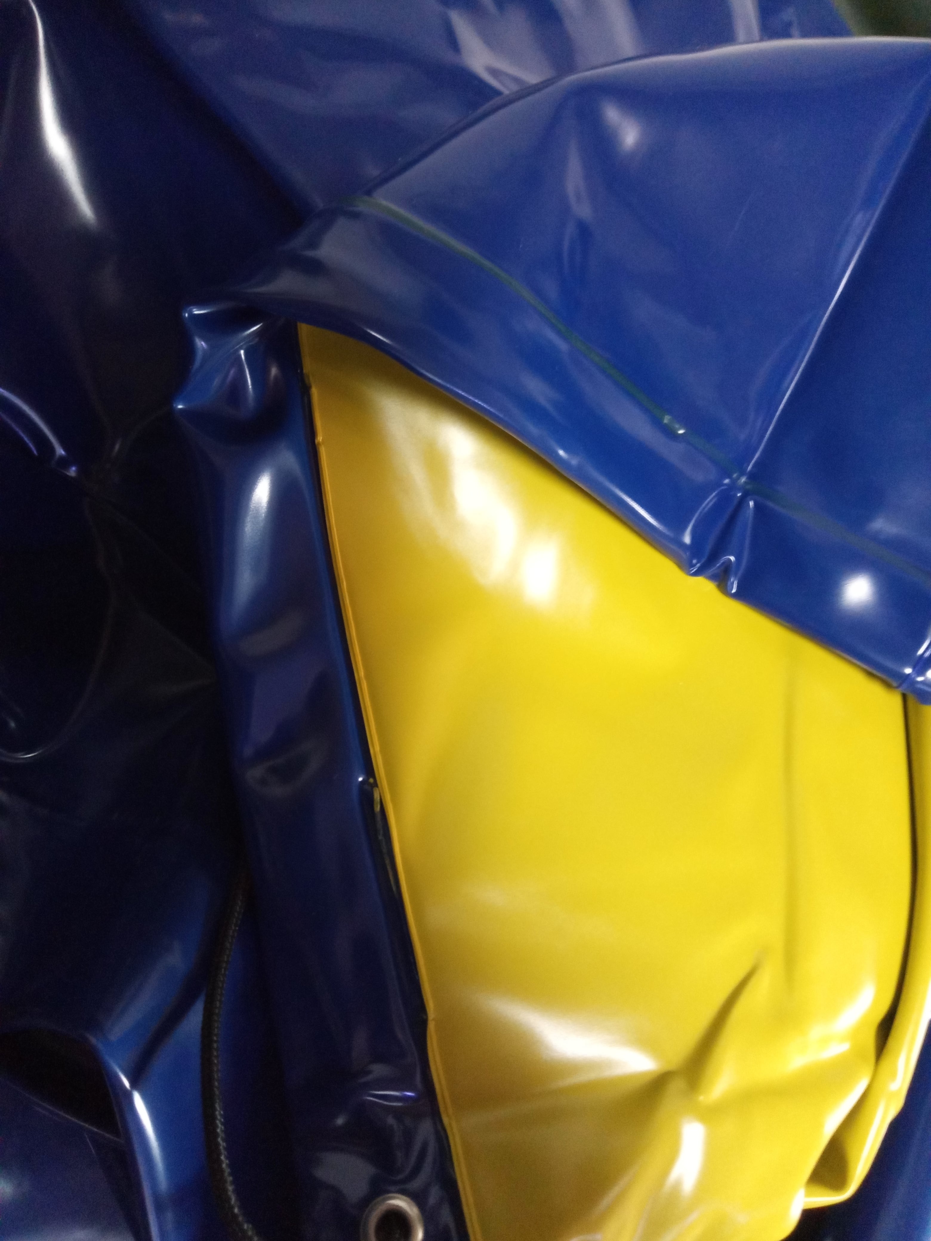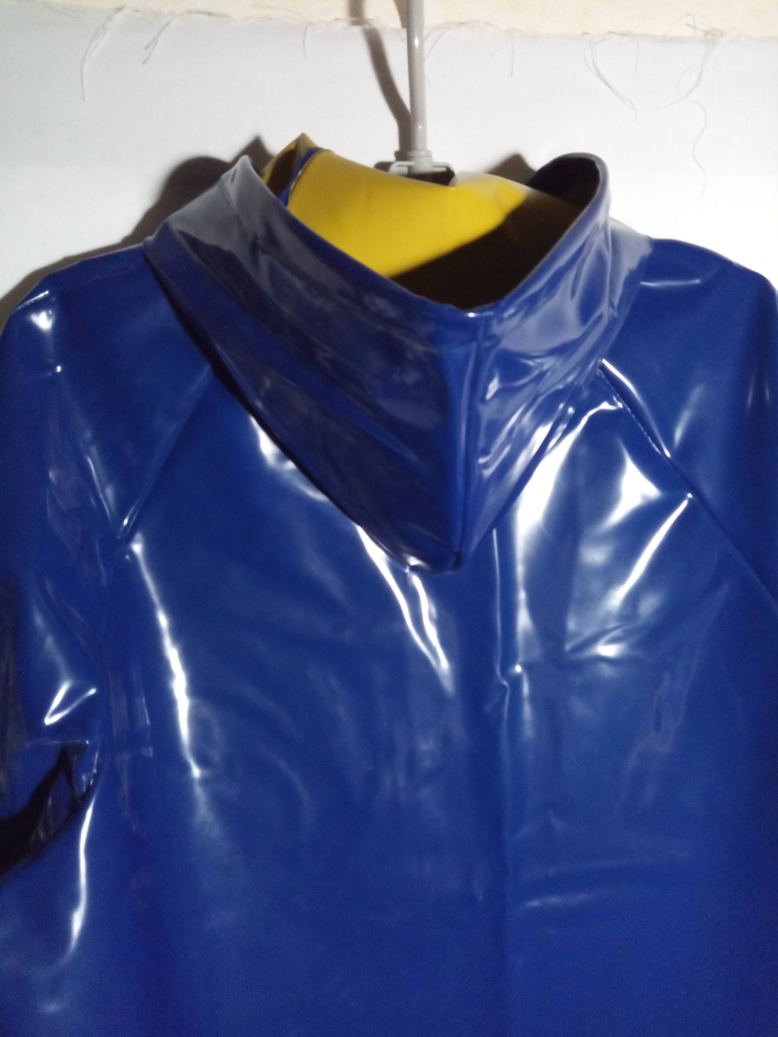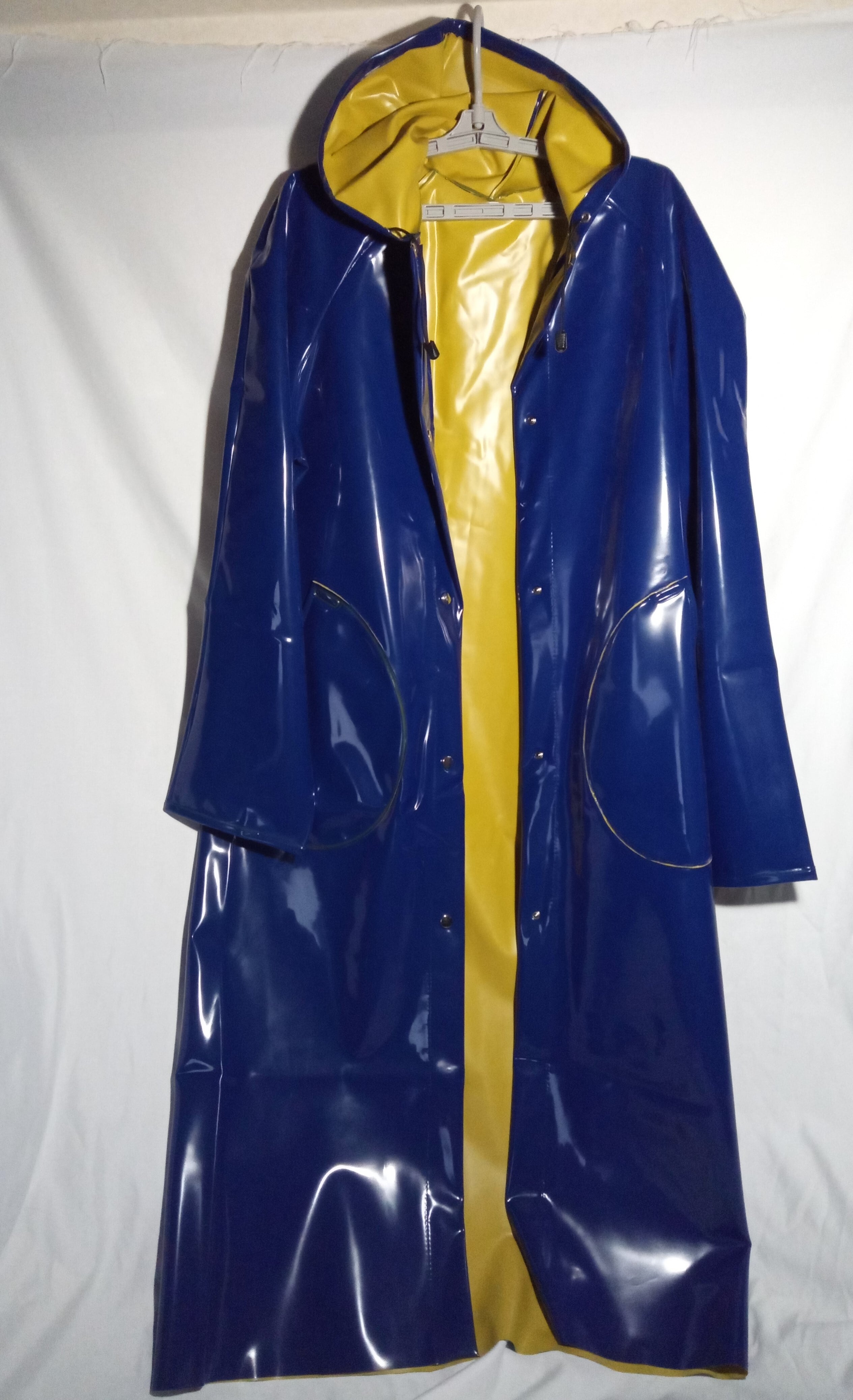 PVC-U-LIKE 表ブルー裏イエローPVC100% セット売り ポンチョ2+上下1セット*ロングコート1(ひも付き)